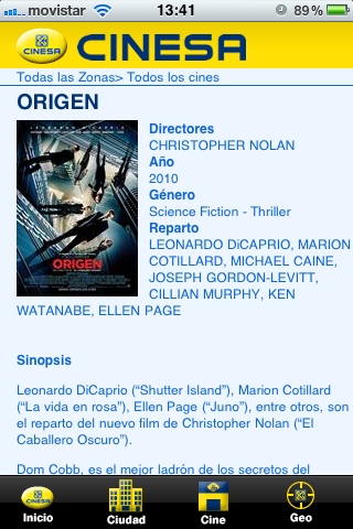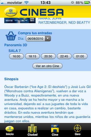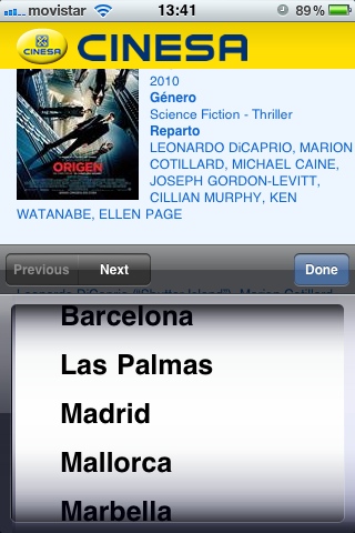 Se puede elegir la ciudad, o la sala de cine concreta para acceder a sus películas. Además se puede usar el GPS para ver cuál es la sala más cercana a nuestra posición.
