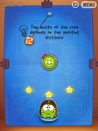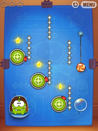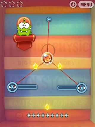 El juego como ya sabréis, consiste en hacer que una golosina llegue a la boca de un simpático bichito que responde al nombre de Om Nom. Para ello tendremos que cortar cuerdas, evitar obstáculos, usar burbujas para subir…