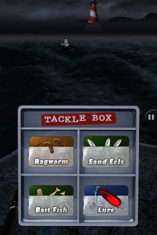 Podemos elegir el tipo de cebo, y dependiendo del que elijamos, cogeremos un tipo de pez u otro. En cada escenario el tipo de pez que podemos coger es diferente. La dificultad varía, hay peces que son muy fáciles de sacar, y algunos tiran con tanta fuerza que se hace muy dificil cogerlos sin romper el sedal.
