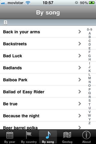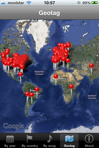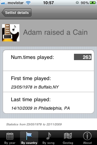 También hay estadísticas de cada canción individual, y te sorprenderá saber cosas como por ejemplo que ha tocado Born To Run 949 veces desde el 78. Puedes buscar por año, por países y por canciones. Además hay un mapa en el que podrás ver cuántas veces ha tocado en cada sitio.