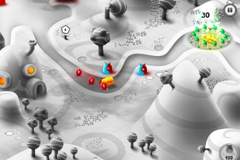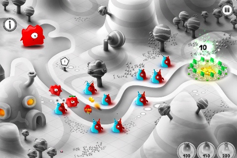 ¿Qué tiene de diferente este juego? El diseño, sin duda. Aquí los enemigos son de dos tipos, rojos y azules. Puedes ir construyendo torres que atacan a los rojos, a los azules, o a los dos. El resto del paisaje está en blanco y negro, lo cual le da un aspecto muy elegante y muy limpio.