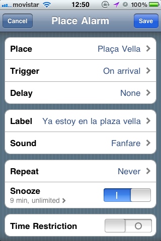Las opciones son muy claras, la aplicación es muy del estilo Apple. Incluye sonidos, modo snooze, e incluso una restricción de tiempo, por ejemplo para que si pasas por la ferretería a las 4 de la mañana, tu iPhone no se moleste en recordarte lo de los clavos, porque está cerrado.