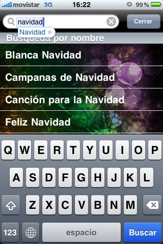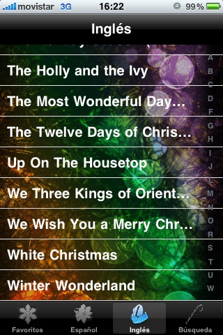 Hay villancicos en castellano y en inglés, más de 150 en total. También hay una sección de búsqueda, que es muy útil si quieres buscar un trozo de un villancico porque no conoces el nombre pero sabes un trozo de la letra.